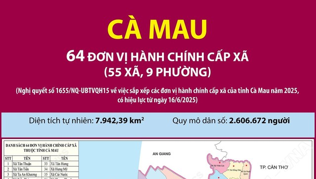 Sau khi sắp xếp, tỉnh Cà Mau có 64 đơn vị hành chính cấp xã,
